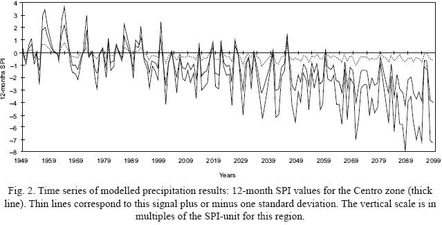 The database obtained by the ensemble of 15 models of the IPCC AR4 includes annual precipitation data and its corresponding standard deviation into 216 gridcells. The time series of 12month SPI for the gridcell centered at 19° N, 99° W (Centro zone) is shown on Figure 2 for the historic period, together with the extrapolation of the relationship between the 12month SPI and the annual precipitation for the historic period projected to the future period. Thin lines correspond to this signal plus or minus the standard deviation associated to the variability of the IPCC climate models. In 2098, the strong decay of the projected precipitation, reaching 3.95 SPIunits, is considered an extreme drought event. In addition, there is a steady increase in frequency and intensity of dry events; 2059 is the last year with an above average precipitation, while the average signal of climate models during 20602098 shows negative SPI values, which would have important socioeconomic consequences, since this region contains the main population and some of the most important economical activities in México.