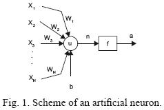 A neuron is a simple unit of data processing. Figure 1 shows the structure of an artificial neuron and the form of transmission of the input data through it. The following notation is used: