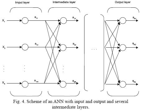 Here, ANNs are considered as artificial data treatment models inspired in the biological nervous system. ANNs are implemented on a computer by means of informatics algorithms that artificially simulate simple elements called neurons. These neurons are interlinked via weighted connections. The information is presented to the ANN in numerical format and by means of a group of input neurons to the network. This information is transmitted to all the neurons of the network through connections, which provide numerical outputs as a result of the input data and the form of propagation of those data through the neurons of the network.