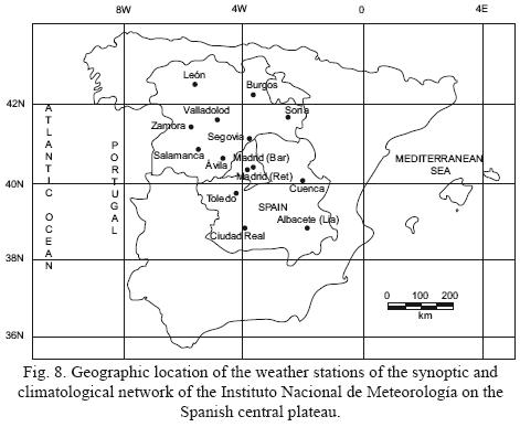 As a result of the analysis and treatment of the initial data, the definitive working series were those corresponding to the observations made at the weather stations in Ávila, Burgos, León, Salamanca, Segovia, Soria, Valladolid, Villanubla (Valladolid) and Zamora, in CastillaLeón, and Los Llanos (Albacete), Ciudad Real, Cuenca, Guadalajara and Toledo in CastillaLa Mancha. Figure 8 shows the geographic locations and coordinates of the stations considered.