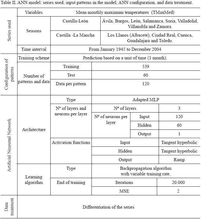 The experimental methodology developed for the fitting of the MLP ANN has shown its efficiency in the design of the model, although this methodology is not necessarily the only one that can be used. The threelayer MLP ANN with the described activation functions, adapted for this study, is able to model in a nonlinear fashion the future values of a TMaxMean time series simply from the past values of the same time series.