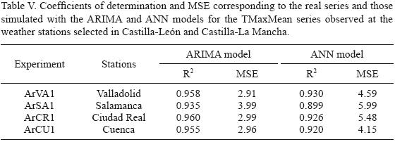 Table V and Figure 11 show the results obtained with ARIMA models and with the model based on the MLP ANN, when they were applied to the TMaxMean series obtained at the stations in Valladolid, Salamanca, Ciudad Real and Cuenca. The values of the indices shown in Table V indicate a high degree of fit between the real series and the simulated ones in all cases.