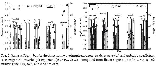 where β denotes Angstrom turbidity coefficient; the wavelength (λ) is in µm. In the present study, α is deduced from a least squares fit of ln (τaer) versus ln (λ) over a selected range of available wavelengths from the sunphotometer measurements (440 to 870 nm). The daily average values of α and β are shown in Figure 5a. These values are compared with those observed over Pune for the same/similar period (see figure caption) in Figure 5b. It is interesting to note that in all campaign α value is smaller at Sinhgad than at Pune. The average α values through out these campaign are 1.10 and 1.23 with range 0.88 to 1.23 and 0.82 to 1.44 for Sinhgad and Pune, respectively. This indicates that contribution from accumulationmode particles to AOD is relatively more over Pune as compared to Sinhgad. However, the β values remained high at Pune as compared to Sinhgad throughout the period of study, as expected.