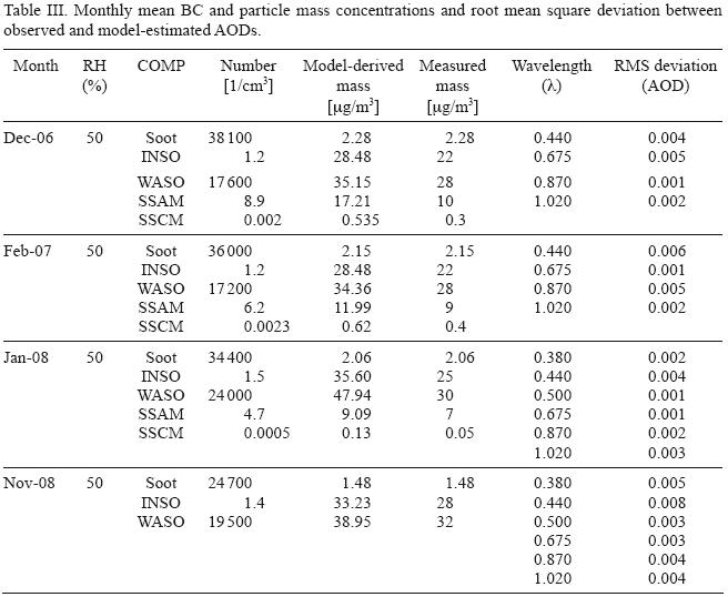 Aerosol properties are highly variable in space and time and it is difficult to model aerosol climatology at any location. However, an attempt is made in OPAC model, which reduces the variability of naturally occurring aerosols and clouds to typical cases, without neglecting possible fluctuations (Hess et al., 1998). The chemical composition of TSP and observed soot concentrations have been used in conjunction with OPAC model to determine certain optical properties of aerosols like AOD, SSA and asymmetry factor. There are ten different aerosol models available in OPAC. Based on the physicochemical history of aerosols over the experimental site, we have used a new mixture, consisting of five aerosol components i.e. water soluble, insoluble, soot or BC, seasalt accumulation mode and seasalt coarse mode.