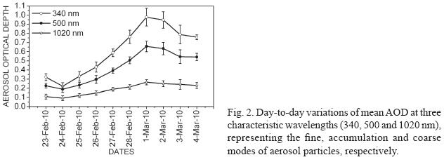 The AOD measurements were carried out using the Microtops-sun photometer. Figure 2 shows day-to-day variations in mean AOD observed from February 23 to March 4, 2010 at the wavelengths of 340, 500, 1020 nm, representing the fine, accumulation and coarse mode of aerosol particles, respectively. The vertical bars show standard deviation of AOD at each wavelength. Greater AOD values having large variability on all days have been observed at lower wavelengths, which decrease with increasing wavelength. The mean AOD showed smallest values on February 24, 2010 indicating that the atmosphere was relatively clean compared to other days of the measurement period. The higher AOD values compared to those on a normal day (February 24, 2010) during the measurement period indicate an additional loading of aerosols over the region. The peak AOD at all the three wavelengths was observed on March 1, 2010 indicating the abundance of fine-mode particles over the study region due to festival activities.