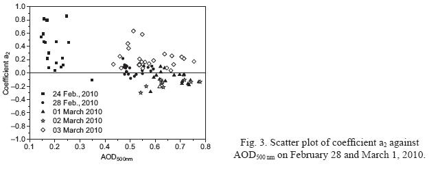 • The scatter plot between coefficient a2 and AOD500 nm on February 24, 28 and March 1, 2 and 3, 2010 shows positive values of a2 on February 28 and March 1, 2010, suggesting the presence of relatively coarse mode particles over the region. However, on February 24 and March 1, 2 and 3, 2010 the majority of a2 values were negative, suggesting the abundance of fine mode aerosols over the study region.
