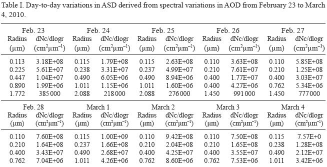 The various effects of aerosols are highly dependent on their size distribution. Aerosol size distribution can be inverted from the spectral variation of AOD by following the constrained linear inversion scheme (King et al., 1978; King, 1982) with the Fredholm integral as