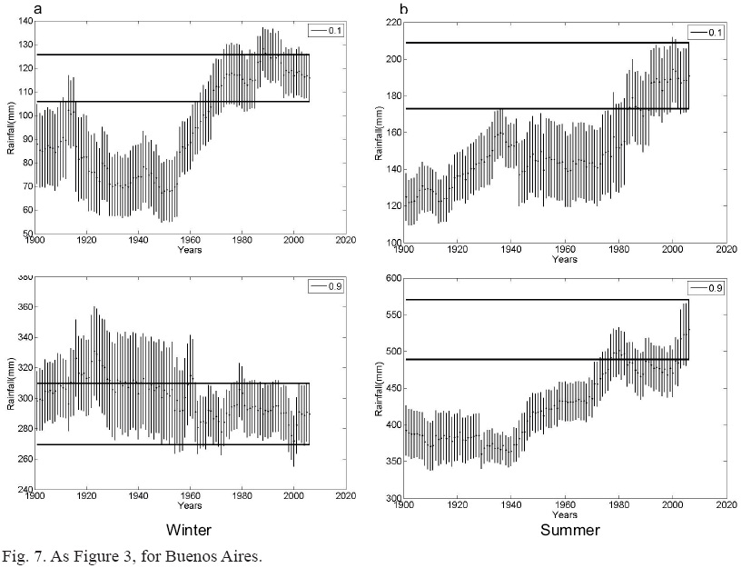 In the RV analysis for the selected probability levels, Buenos Aires shows the lowest extreme D values for winter in the period 1880-1920. Sudden increase from then on almost doubles their minimum value. However, for the W end, winter RVs decrease or remain almost unchanged, depending on the RP. Unlike winter, RVs for summer rainfall have increased more or less gradually, both for the D and W end, with some multi-annual fluctuations.