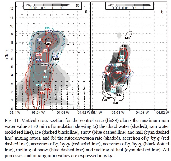 Figure 11 shows the vertical cross section, along the maximum rain water, of hydrometeors distribution and the processes that contribute to rain formation in the control case at 30 min of simulation. At that time, the cloud horizontal and vertical extent is similar to that shown in clean and polluted cases (Fig. 5a, b), indicating no marked differences in the spatial structure of clouds among simulations. Nevertheless, the control case exhibits smaller cloud water values. The rain water and hail mixing ratios are distributed over a larger area in the control case, from the cloud top to the surface in the case of rain water, and from the cloud top to a few kilometers below the FL in the case of hail.