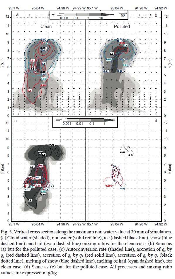 Vertical cross-sections of different hydrometeor mixing ratios and the processes that contribute to rain formation for the clean (Fig. 5a, c) and polluted (Fig. 5b, d) cases are shown at 30 min of simulation in order to analyze their spatial distributions during the initial stages of rain formation. At this time, both clouds show the same vertical and horizontal extent through inspection of cloud water in Figure 5a, b. However, larger values of cloud water are located above the FL in the polluted case, at heights where hail has formed. The clean case shows larger values of rain water and hail, as well as a wider extension of rain water all over the cloud. Maximum hail values are located near the FL in the clean case whereas they are located well above the FL in the polluted case.