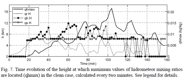 Despite the differences that exist in the clean and polluted initial droplet spectra used in this study, the resulting reduction in precipitation is smaller than in the studies of Khain et al. (2004, 2005) and Lynn et al. (2005 a, b, 2007). One possible explanation for this is the availability of supercooled cloud water that contributes to the quick formation of snow from its interaction with cloud ice and the accretion with snow particles originally formed by cloud ice to cloud ice interaction. Larger amounts of cloud water and snow above the FL may explain the rapid increase ofhail in the polluted case (Figs. 3, 5). Both melting of snow and hail contribute to diminish the differences in precipitation with the clean case. Another factor may be related to the ambient relative humidity, which was very high in the present study and initially the same in all simulations. These humid conditions are typically observed in maritime tropical regions, likely causing that the reduction in precipitation at mid and low levels, related to evaporation and sublimation of small particles, be small.