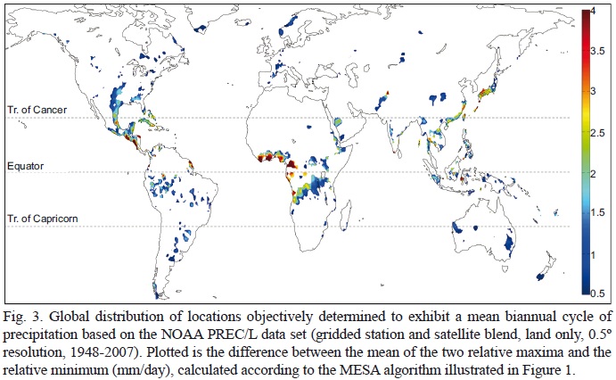 Given the multitude of global, gridded land precipitation data sets available, a worthwhile starting point for understanding the basic mechanism(s) for the MSD is its global distribution based on the objective MESA algorithm described in the previous section. The resulting map from one such data set, NOAA PREC/L (Chen et al., 2002), is shown in Figure 3. Even in this land-only data set, the global prevalence of the MSD is quite surprising, including South America, south/central US, Japan, the east coast of China, central Africa, and coastal Australia. The flexible nature of our MSD algorithm (MESA) enables illuminating regions that experience a biannual seasonal cycle of rainfall without the constraint that the mean climatology be parametrically identical to that of the GCR. The distribution of biannual precipitation over Africa is rather interesting, with a strong biannual signal on either side of the equator, which is probably related to the seasonal migration of the ITCZ. The biannual signal hugging the Gulf of Guinea in west and central Africa indeed appears to be the strongest on the planet. Despite the fact that the MSD is a more globally prevalent feature than previously thought, the MSD over the GCR stands out especially in spatial scale and coherence.