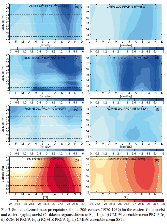 Finally, although the RCM simulations add regional detail to climate simulations produced by the GCMs in this region, the RCMs use dynamical downscaling techniques making their performance critically dependent on the quality of the driving GCM. These results indicate that, for spatial scales in question, improvements in model physics may contribute perhaps as much to our understanding of climate of the Caribbean as dynamical downscaling to 50 km resolution. For example, considering the major influence of SSTs on the climate of the Caribbean and on simulated precipitation, accurate representation of SSTs in the models could improve their performance. The dynamical downscaling using PRECIS RCM uses prescribed SSTs, but a model set-up in which SSTs are allowed to dynamically interact with and respond to changes in the overlaying atmosphere has been shown to perform better at simulating precipitation in other parts of the world (Artale et al., 2009; Ratnam et al., 2009). Such RCM studies are, however, non-existent for the Caribbean region.