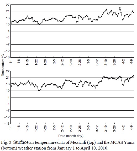 First we plotted the weather station surface air temperature data from January 1 to April 10, 2010 (top of Fig. 2). The data are derived from the Mexicali surface station, whose location is 32.667° N, 115.458° W, around 50 km north from the epicenter. It is the nearest station to this point. Data were downloaded from the National Climatic Data Center (NCDC) of the National Oceanic and Atmospheric Administration (NOAA). The data show that there is a peak value (24.5 °C) on March 30, which is also the largest value in the prior 90 days. Checking other stations north of Mexicali, we did not find similar peaks. For example, the Marine Corps Air Station (MCAS) at Yuma (32.65° N, 114.6° W), which is about 78 km away from the epicenter, shows no peaks on March 30. Its temperature increases only 1.2 °C compared to that of March 29, while the Mexicali temperature increases 5.2 °C (bottom of Fig. 2). Due to the absence of weather data for Mexico, we could not plot the spatial distribution of temperature change in the epicenter area, so we turned to the National Centers for Environmental Prediction Final Operational Global Analysis (NCEP-FNL) reanalysis data, which provide temperature data with 1° spatial resolution and 6 hours temporal resolution.