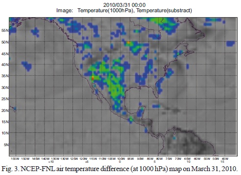 NCEP-FNL provides global air temperature, humidity, pressure, sea surface temperature and so on every six hours with 1° resolution. It uses a state-of-the-art analysis method to perform data assimilation with ground weather station and satellite data. These data have no such problems as clouds cover or interpolation, and they are continuously providing a reliable database to analyze thermal anomalies eventually present before the earthquakes. Figure 3 shows the air temperature difference between 00:00 UTC on March 31 and 00:00 UTC on March 30 (18:00 LT) at the 1000 hPa level. We can see clearly that the greater difference in temperature (around 7 °C) is exactly in the epicenter area; it is also the maximum value in the whole North American subcontinent, while in other areas there is only a medium-low temperature difference. The map area is located between 40-160° W and 0-60° N, with a spatial resolution of 1°, which means there is a total of 120 x 60 = 7200 grid points in this area. Temperature shows its maximum difference only in the epicenter grid point, so the probability of this occurring by simple chance is 1/7200. The west coast of the American continent from Alaska to Mexico (60-0° N) and the Haitiarea are earthquake-prone. Including both areas, there are about 100 grids in which earthquakes bigger than M7.0 can take place. In the large area shown in Figure 3, the probability for a grid to have the highest temperature change concurring with a M7.0 earthquake is 1/7200 x 1/100 = 1/720 000. Suppose that any day from March 20 to April 10 can have the highest temperature, so the odds are 1/20. If we consider that the three events coincided in the same grid, the likelihood will be 1/720 000 x 1/20 = 1/1 440 000. This very small probability shows the thermal anomaly is very likely related to the earthquake. Admittedly, in Figure 3 there is also another high temperature spot northeast to the epicenter, located at 95° W, 50° N. It is the second warmest spot in the whole area, which is located in high latitude where no earthquake activities bigger than M3.0 have taken place in the last 40 years. So it is a very stable area and the recorded temperatures could not have its origin in a seismic thermal anomaly. The possible cause need to be further investigated.