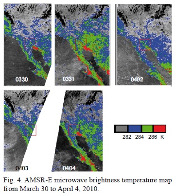 We also examined the microwave brightness temperature data derived from the Advanced Microwave Scanning Radiometer onboard the Earth Observing System satellite (AMSR-E). AMSR-E is a six-frequency dual-polarized total-power passive microwave radiometer that measures water-related geophysical parameters supporting global change science and monitoring efforts. Here we used the AMSR-E L2A global swath spatially resampled brightness temperatures product in 89.0 GHz frequency. This data are resampled to obtain spatial consistency, and therefore are available at a variety of resolutions that correspond to the footprint sizes of the observations such as 56, 38, 24, 21, 12, and 5.4 km. The corresponding resolution for 89.0 GHz is 5.4 km (Ashcroft and Wentz, 2006). The results show that the microwave brightness temperature reaches its peak on March 31, in quasi-synchronism with the air temperature anomaly in Figures 3 and 4. Then it decreases until April 4, when the earthquake occurred (Fig. 4).