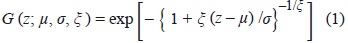 where (-oo < μ < oo), a > 0, and (-oo <ξ < oo) are the parameters of location, scale, and shape, respectively, and x+ = max(x, 0). The type of extreme distribution is determined by the sign of ξ; ξ < 0 corresponds to the Weibull distribution, ξ = 0 to the Gumbel distribution, and ξ > 0 to the Fréchet distribution. The value of ξ determines the behavior of the tail of the distribution. If ξ < 0, a distribution with a defined upper limit is obtained, while ξ > 0 corresponds to an increasingly upper tail.