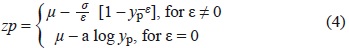 where p = -log (1-p). If zp is plotted against log yp, the plot is linear in the case ξ = 0; if ξ < 0 the plot is convex with an asymptotic limit according to p 0 at μ - σ/ξ and if ξ > 0, the plot is concave and does not have a finite bound. This graph, named return level plot, is particularly useful for the presentation and validation of the model. Probability and quantile are other diagnostic plots determined based on (1). To complete the diagnosis, a comparison is made between the probability density function and the GEV of the data histogram.