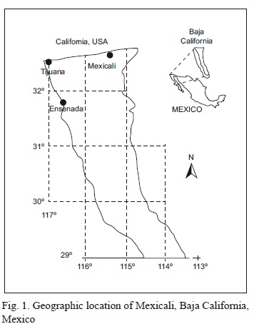 The city of Mexicali is located in northeastern Baja California, Mexico, at 32.55° N, 115.47° W and 4 meters above sea level. It borders California, USA to the north (Fig. 1). Mexicali has a dry, arid climate with winter rainfall and wide annual oscillation of mean temperatures (BW(h')hs(x') according to the García [1988] climate classification). To this climate description can be added that Mexicali has one of the most extreme climates in Mexico, with average July high temperatures of 42.2 °C, and average January highs of 21.1 °C. Mexicali receives 90% of the potential daylight hours each year, and on average 75 mm of rain annually. On July 28, 1995, Mexicali reached its all-time high temperature of 52 °C, and on January 13, 1963 its all-time low temperature of -7.0 °C (García-Cueto and Santillán-Soto, 2012).
