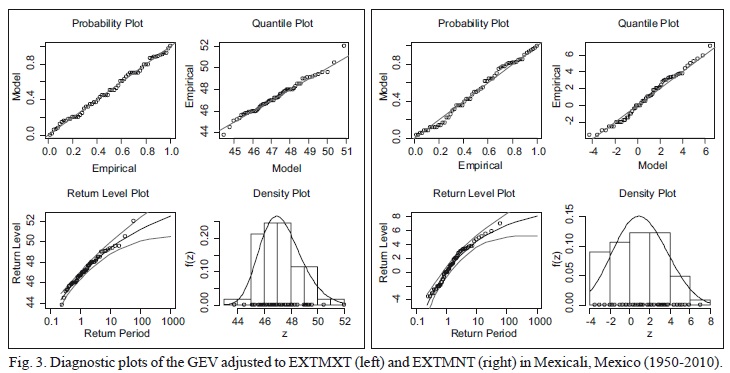 We used daily maximum and minimum temperature data from the Mexicali meteorological station. Data were obtained from the records of the Comisión Nacional del Agua (CNA, National Water Commission). Most of the historical information is digitized in the ERIC (Extractor Rápido de Información Climatológica [Rapid Extractor of Climate Data]) V2.0 compact disc. These data, however, had not undergone strict quality control. When large time gaps (which in some cases consisted of several years) were found, the primary sources for these data, including handwritten daily records, were consulted from the original archives. Following this approach, a complete climatological baseline from 1950 to 2010 was developed. Two periods were selected for analysis: summer months from June 1 to September 30, and winter months from November 1 to February 28. This study considered the following: (a) annual maximum and minimum temperature extremes, (b) daily maximum and minimum values of temperature for the selected period. The first consideration leads to the application of the block maxima statistical approach and the second to a threshold value approach. Respect to quality control (QC) data, software RClimdex (1.0) was used (Zhang and Yang, 2004). The main purpose of this QC procedure was to identify errors in data processing, such as: (i) errors in manual keying, (ii) verifying that maximum temperature always exceeded minimum temperature for every calendar day, (iii) identifying data values as outliers in daily maximum and minimum temperature (these values were over four standard deviations (σ) and flagged as potential errors). Daily temperature values were manually checked and edited case by case. Only those values that were confirmed to be erroneous were set to missing and deleted from further analysis. This process of removing inhomogeneous data from the analysis reduced the amount of records originally available. To summarize, of the 16 653 records checked only 10 suspected as erroneous were identified, meaning 0.06% of the whole. These values were checked one-by-one from the original archives and five of them were validated and retained in the dataset as true values; the remaining five were converted to missing values.
