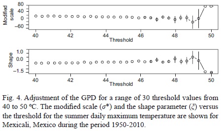 The GPD uses more information than the GEV model, which is based solely on blocks of annual values. Therefore, the GPD was adjusted to the maximum daily temperatures of Mexicali (6600 data points for the period 1950-2010). The maximum likelihood estimators of the modified scale (σ) and shape parameter (ξ) plotted versus u for the daily maximum temperatures, are shown in Figure 4. Parameter perturbations are small until the chosen threshold of 46 is reached.