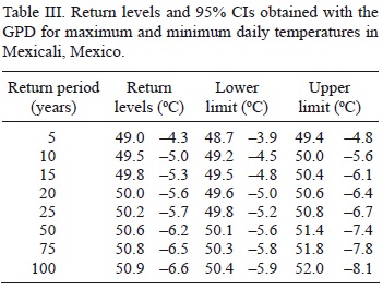 For winter minimum daily temperatures, the threshold (u) was also selected to fit the GPD. Parameter perturbations are small until the chosen threshold of -1 is reached. The estimators are (σ, ξ) = (2.18, -0.21), with standard errors of 0.14 and 0.04, respectively. The 95% CIs are (2.32, 2.04) for σ and (-0.25, -0.17) for ξ. According to the negative values of the shape parameter, the tails are finite. The GPD model was not rejected because the likelihood ratio statistic was greater than the goodness of fit test x2 (14.96237 > 3.84146). The p-value associated with the likelihood ratio test is 0.000109. Table III shows the results of the estimated return levels and the 95% CIs for the daily maximum and minimum temperatures.