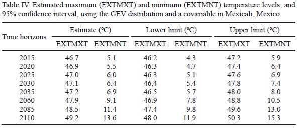 The parameter μ1 corresponds to the annual rate of change in the extreme temperature series. To select the most suitable model, the likelihood ratio test was used. This test yielded a value of 38.2 for EXTMXT and 32.8 for EXTMNT, which are above the critical value of X121-0.05 , which is 3.84. The inclusion of a linear trend as a covariate in the GEV location parameter (μ) for EXTMNT and EXTMXT produced a significant improvement (at the 5% level). Specifically, the model obtained for the EXTMXT is μ (t) = 46.7 + 0.02567t, where t is time. By increasing the variable t, location parameter values are increasingly positive, indicating that the extreme values of maximum temperature will be more severe. For EXTMNT, the model obtained is μ(t) = -4.0 + 0.09t. The location parameter values are increasing with increasing time; therefore, the minimum temperature extremes will be less severe. Table IV shows the exceeded estimates of EXTMXT, the unsurpassed estimates of EXTMNT, and the 95% CIs (°C) obtained using the profile-likelihood method for several time horizons.