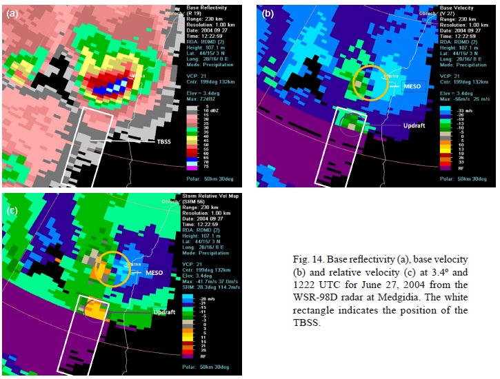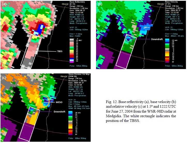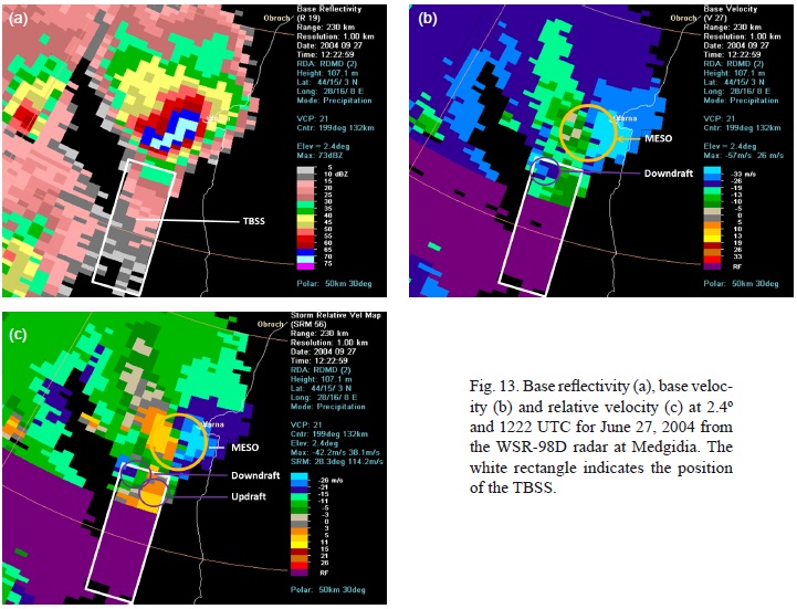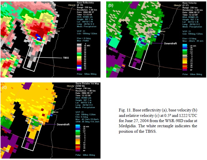 On September 27, 2004 the S-band radar installed at Medgidia, Romania detected a very strong storm in the city of Varna, Bulgaria. According to the European Severe Weather Data Base (ESWDB) the storm produced 4 cm hailstones and two victims in 15 minutes. According to the radar data, at 1222 UTC the storm was situated southwest of the city, and a TBSS could be observed both on the base reflectivity and Doppler velocity fields at the first tilt (Fig.11). The TBSS region displays negative velocities associated with the downdraft region close to the high reflectivity core of 60-70 dBZ, west of the city of Varna. On the storm relative velocities we can observe a rotational structure close to the city of Varna (Fig. 11c), and we notice the presence of negative relative velocities in the TBSS region.