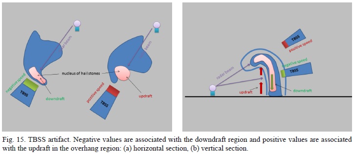 In summary, in the region of the TBSS artifact we can have negative values associated with the down-draft region and positive values associated with the updraft in the overhang region (Fig. 15). The storm that affected Varna displayed the TBSS artifact on the S-band radar at Medgidia one hour before the hail fell on the ground.