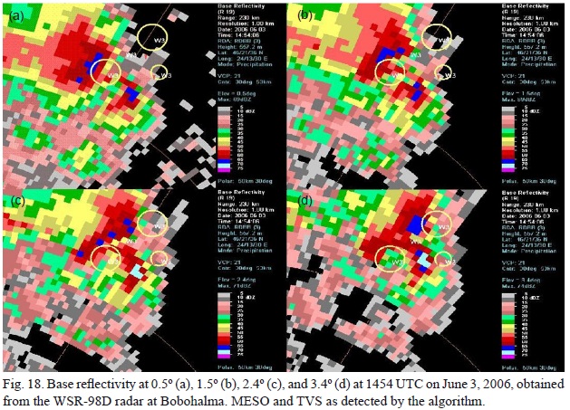 The TBSS signature is a very important warning tool, although it cannot give an anticipation of more than 30 minutes, since it is detected at high levels in the storm; however, the hail spike can affect the radial velocities and produce disruptions in the radial velocity field that can generate unreal mesocyclon-ic and tornadic vortex patterns, and these may be artificially identified by the algorithm. In this case severe weather (both large hail and tornado) was reported at the ground and the warning was correctly issued, despite the "interference" between the TBSS and the radial velocities analyzed by the MESO and TVS algorithms. The problem is most critical when a scanned low-level mesocyclone is immediately downrange of a hail core, which is not an unusual situation for a supercell storm. Subjective verification of the characteristic pattern of the supercell is extremely important in order to "validate" the output of the severe weather detection algorithms.