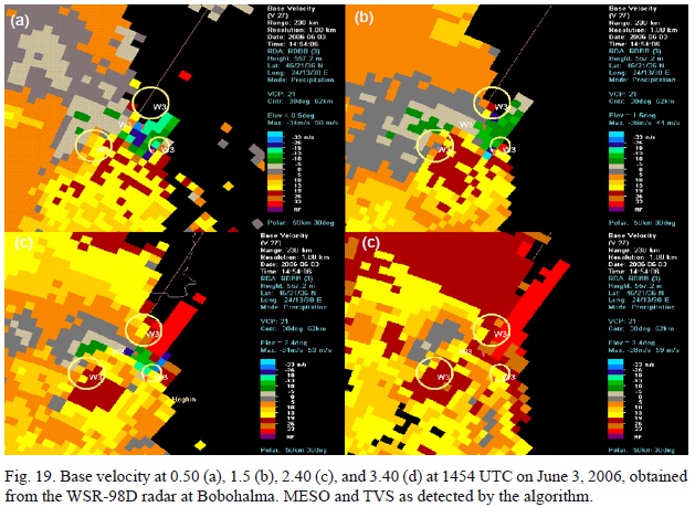 Advances in computer and radar technology, coupled with a dramatic increase in meteorological data sets, were not the only challenges to the forecasters. New conceptual models had to be learned and assimilated in operational practice as S-band radar allows the detection of severe weather associated with convective storms. Thus, mesocyclones (MESO), tornadic vortex signatures (TVS), low level and mid altitude convergence zones, became nolens volens usual terminology in nowcasting activities, despite a general belief that tornadic storms did not occur in Romania. Observing convection in Romania through the new S-band radar network provides a sharper perspective on mesoscale environments and the storms these environments create. Highly organized convective systems, such as supercells, can be better anticipated using useful radar pattern recognition software routines such as the MESO (Stumpf et al., 1998) and the TVS (Mitchell et al., 1998) algorithms. However, while these algorithms do demonstrate some skill they also are susceptible to radar artifacts and sampling limitations. Moreover, they sometimes fail to detect critical signatures that may be subtle or fail to meet certain thresholds. For this reason the meteorologist must carefully examine the base data, so as to evaluate potential signature existence or non-existence.