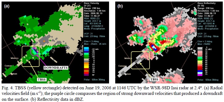 The case presented was observed with the Iasi system (a WSR-98D S-band radar) on June 19, 2006, in the northeast part of Romania. This storm exhibited classic TBSS signatures. The Iasi radar was operating in volume coverage pattern (VCP) 21 with nine elevations scans every 6 min. The first four elevations used in the operational environment were: 0.5º, 1.5º, 2.4º and 3.4º.