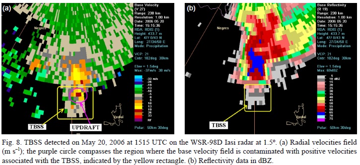 In this case the storm produced hail stones with diameters of about 7 cm at Negresti, a village in Moldavia. The TBSS (Fig. 8) contaminates the base velocity field with positive velocities due to the presence of a strong updraft at lower level. This updraft promoted the growth of very large hail, and the growing hailstones were carried across the updraft by the conserved, low-level, horizontal momentum feeding the updraft