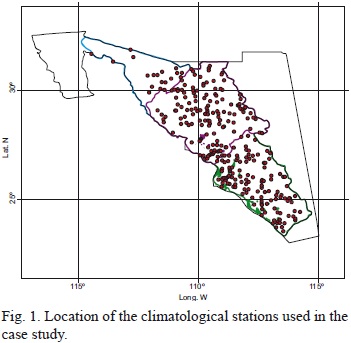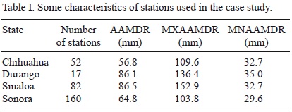 A region located in northwestern Mexico, with a total of 311 climatological stations was selected to apply the proposed methodology (Fig. 1). Records of annual maxima for daily rainfall were gathered for the period 1965 to 2006 from the Rapid Extractor of Climatological Information version 3 (ERIC-III, by its initials in Spanish) database (IMTA, 2012). This period of time was selected because we had 88% of the available information. The inverse distance weighting (IDW) interpolation analysis was chosen for estimating missing data. The number of stations used and its average annual maximum of daily rainfall (AAMDR) by each Mexican state are presented in Table I (MXAAMDR and MNAAMDR stand for the maximum and minimum value of AAMDR, respectively).