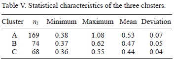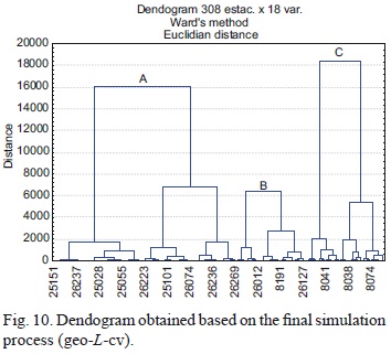 Finally, the geographical characteristics of latitude, longitude and altitude of each climatological station are added to the Z-cv values from the former step. With this group of variables a new matrix is formed. The HAC analysis generated three well-defined clusters. A very important result was the migration of stations from the middle zone to the coastal region. So, group A would be located in the strip along the coast, bounded by an imaginary line 120 km inland. Group C corresponds to a mountain region; meanwhile, the middle zone was narrowed within both regions but extended along them. Figures 10 and 11 present the dendogram and clusters of the final simulation process.