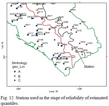 Once homogeneity is achieved and regions are defined, it is necessary to show the effects of the inclusion or exclusion of information in the regional analysis. For this purpose, at-site and regional at-site estimates of the maximum daily rainfall for different return periods were obtained for the illustrative case of station number 25 036 (Fig. 12). For this station, the annual maxima of daily rainfall for the period from 1965 to 2006 were collected.