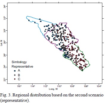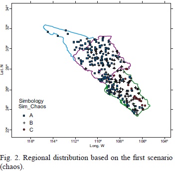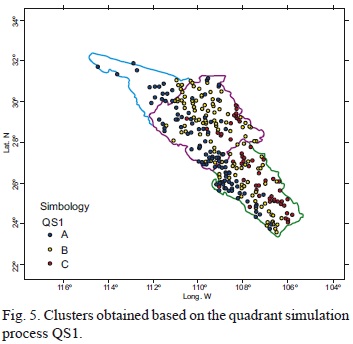 A better definition of clustering is achieved with a simulation process in the third quadrant (QS3). Intersections among groups significantly decreased (Fig. 7). Group A is located in the strip along the coast, with a short penetration inland and bounded by an imaginary line 40 km inland, meaning this is a coastal region. Group C corresponds to a mountain region; meanwhile group B is located in the central belt between groups A and C. These variables were considered for the last part of the study.