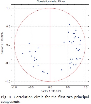 PCA is performed in the space of the r variables and, in dual form, in the space of m sites. Variables and sites can be graphically represented by considering the first and second component as coordinate axes. A point-variable is represented by the coordinate corresponding to that variable in each of these components. The cloud of points-variables is located in a circular area of radius 1. The proximity between the point-variables indicates the degree of correlation between them. When the correlation is equal to one, the points coincide.
