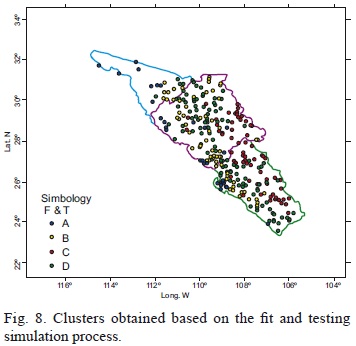 This phase of the study was conducted in order to achieve the optimization of homogeneous regions. Until this point, it was observed that the most important variables to define a homogeneous region were CVN-DRY, CVAR and CVMDR#. In order to improve the simulation process, these coefficients were substituted by the Z-coefficients of variation (Z-cv) obtained by using Eq. (10). In this step some intersections among regions can be found (Fig. 9), however the formed clusters present a better definition than the F&T case.