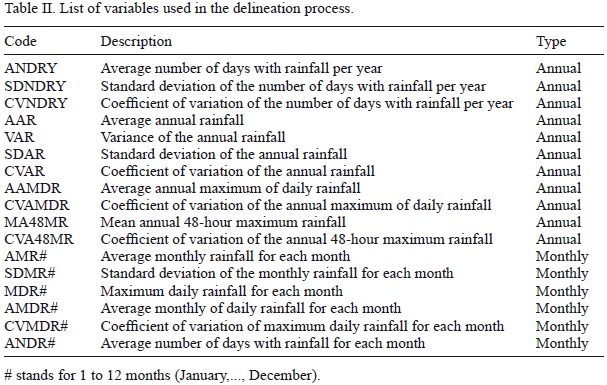 A first step to apply the PCA and HAC multivariate methods is the selection of variables to be analyzed. In order to achieve this, two sets of data were considered: The first one containing 11 annual variables and the second one consisting of 72 monthly variables, all of them from precipitation data (Table II). With this information a total of 83 variables were defined for each one of the 311 climatological stations. So, the first matrix of this analysis has 311 sites with 83 variables.