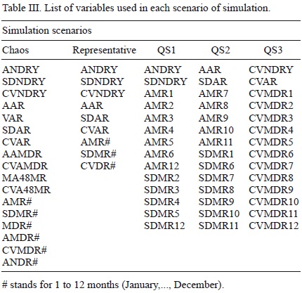 After PCA was applied to the 311 * 42 matrix, it was concluded that the first component explains 38.61% of the population variance and the second one 16.32%. According to Figure 4, only a site-variable matrix could be constructed for the first, second, and third quadrant. It was not possible to construct the fourth quadrant because there was only one variable available. The variables created for dry season months fell into the first quadrant (QS1); the variables in the second quadrant (QS2) mostly correspond to rainy season months, and finally the third quadrant (QS3) comprises the coefficients of variation (Table III).