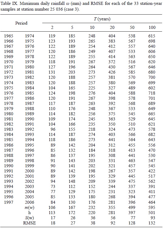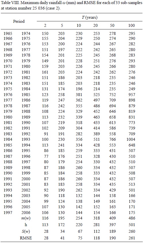 Case 2. The at-site estimates of the maximum daily rainfall for station number 25 036 are obtained by considering a set of 33 sub-samples of length n = 10 years (short samples). So, the record of annual maximum of daily rainfall for the periods 1965-1974, 1966-1975,..., and 1997-2006 are grouped. For each of them, at-site estimates of maximum daily rainfall are obtained by fitting the same distributions of the former case. These values are considered as the "estimated values" for short samples a. The corresponding RMSE values are presented in Table VIII.