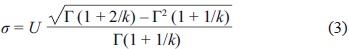 where k (dimensionless) and A (m/s) are the shape and scale parameters, respectively. The mean and standard deviation of the respective PDF are given by Hennessy (1977):