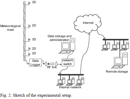 At the base of the tower a Data-Logger (DL) NDL485 (Wilmers Messtechnik GmbH), interrogates the anemometers and stores the readings in its internal memory, capable of retaining about eight hours of high frequency data stored in ASCII file format, each file containing one hour of experimental data. The DL is connected to the network via a radio-frequency (RF) link (using radios and two directional Yagui antennas), which in turn is connected to a network switch, as shown in Figure 2. This switch allows for the communication with a file server, which retrieves the information from the DL every two hours. Each file contained an hour of high frequency data (about 3 MB of data), which could overload the wireless communication link if the files were immediately downloaded to the server. The two-hour data retrieval period proved to be robust enough to allow for the DL to perform its acquisition and communication tasks safely. Additionally, a remote server in Mexico City performs the same data retrieving routine in order to have a backup copy in case of failure of the main computer (see "Remote storage" in Fig. 2). This setup permits the correct data retrieving in case that the internal network is temporarily down, and allows for real-time access to the DL. Two solar panels and a rechargeable (deep cycle) battery provide energy to the sonic anemometers, the DL, and the RF radio transmitter. The data storage and administration tasks comprise storing the raw data files and the maintenance of an online OpenSource database where average data is stored for collaboration with other colleagues and institutions. This database also contains a table with other meteorological variables coming from a meteorological station located at the base of the tower (z = 1.5m).
