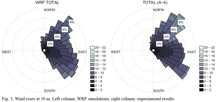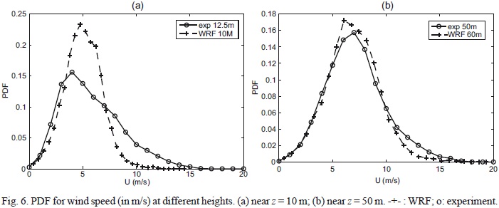 When compared with the PDF from the WRF mesoscale model, the experimental curves differ considerably for low heights, as shown in Figure 6, where the curves corresponding to z = 10 m obtained numerically (crosses) and the one corresponding to the mast at z = 12.5 m are presented. On the other hand, above z = 50 m the model obtained very reasonable results, shown in Figure 6b. The reason for this discrepancy at low heights is the parameterization of the surface layer in the numerical model; the conditions of both offshore and onshore winds are perturbed by the presence of internal boundary layers. Above the influence of these perturbed profiles the numerical prediction does a much better forecast. The complexity of the terrain, as well as land-sea interface play an important role in wind characterization. These effects are not taken into account in mesoscale models because of the coarseness of the grid, and could be parameterized using the state of the art of internal boundary layers (Savelyev and Taylor, 2005); however, the introduction of such effects is very likely to require a mesh refinement (e.g., along the coastline), which in turn implies necessarily some computational cost. The effects of topography at the micrometeorological scale can be assessed by taking the mesoscale simulation as the input for a microscale simulation; this is a very active field of research (Churchfield et al., 2010; Jonkman, 2013; Serrano et al., 2014) in view of the transition to clean energy production, which will be implemented during the first half of this century.