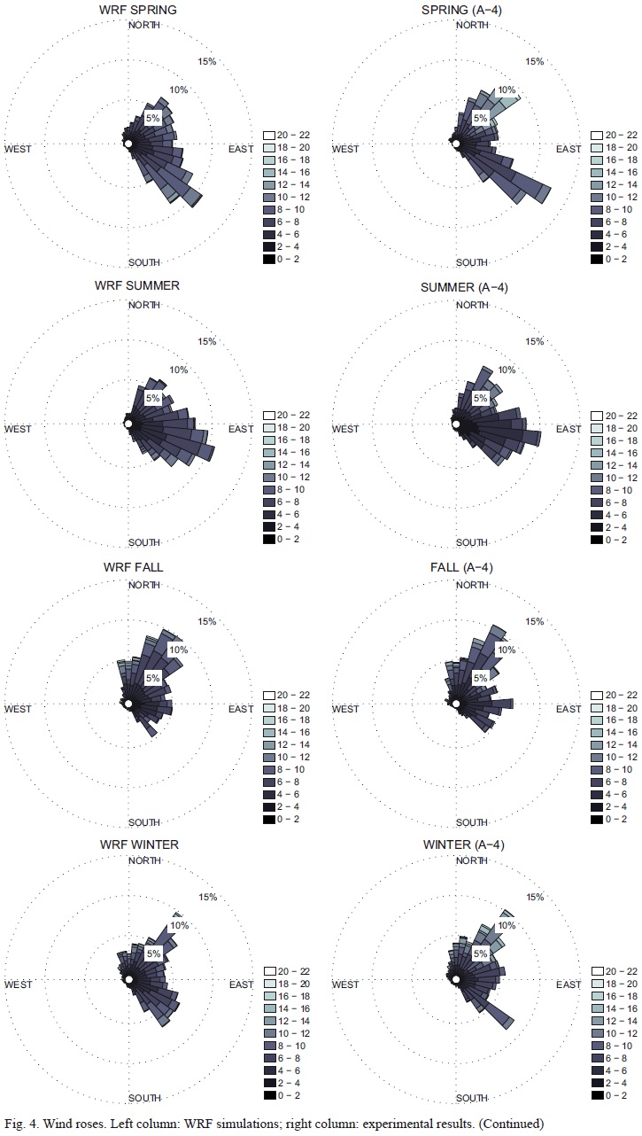 The wind speed and direction are presented in Figure 3 in the form of wind roses: to the right, the experimental data at 50 m is presented. The sub-figure to the left comes from averaging the WRF simulation data. Both results are very similar, but one can observe that some differences arise in terms of wind speed. The figure also shows that the more energetic winds come from the northeast, while the most frequent direction is the southeast. The same data, averaged seasonally, is presented in Figure. 4; again, the simulations can reproduce the behavior of the wind correctly. Note that the WRF wind rose for the winter is different from that of the mast, particularly for the southeast, where the mast presents a large frequency peak. Winds coming from that precise direction pass over the marshland and are then channeled to the mast through a terrain where there are very few buildings, so it is reasonable to assume that these differences in the wind roses are due to the complex terrain configuration (not taken into account by the WRF model). Comparisons between the anemometer at z = 12.5 m can also be made, since the WRF model gives the velocity at z = 10 m, and although there are similarities, sharp differences exist, as will be evident from the PDFs shown in Figure 6.