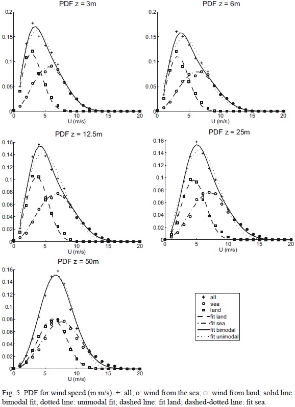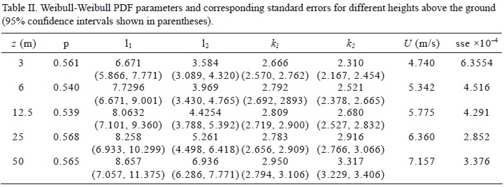 where Nsea is the number of events in which the average wind direction came from the sea, and Ntotai is the total count of events (about 14 000 30-min events). The next step is to separate all the experimental points coming from the sea, and fitting a Weibull curve (with a least squares criterion) to obtain its corresponding ki and 2.h Then, the same process is carried over with the data coming from land, in order to get k2 and X2. The results are presented in Figure 5, where the PDF for winds coming from the sea (circles), land (squares), and all directions (crosses) is presented, for five different heights above the ground. The bimodal character of the curve is clear for low heights (z = 3 and 6 m), where a "hump" coming from the larger wind velocities from offshore is apparent. As the height above the ground increases, this feature is less evident, as can be seen from z = 25 and 50 m. The bimodal fit is in all cases better than the unimodal one; for example, at z = 50 m the WW fit gives a sum of squared errors sse = 0.3376 x 103, while the corresponding error for a W fit is sse = 0.7816 x i03. The parameters and their corresponding confidence intervals are listed in Table II.