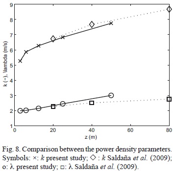 Power densities (W/m2) as a function of height z are shown in Figure 7, where crosses represent the power density Z)b obtained with a WW PDF (this study), circles represent the unimodal power density Du, and the results of Saldaña and Miranda (2009), which are unimodal, are shown as squares. There is good agreement in terms of the power densities Db (this study) and DuS (Saldaña and Miranda, 2009). The corresponding unimodal parameters k and l are shown in Figure 8, for completeness. These parameters are similar in both studies; however, there is a significant difference between the unimodal power densities DuS and Du. The results of Saldaña and Miranda (2009) were obtained during a 3-year observation period, while our data covered only one year; our bimodal estimations of the power density are very similar to those obtained by these authors, so it is more likely that our bimodal estimations are more precise than the corresponding 1-year unimodal versions. The point corresponding to z = 80 m in Figure 8 is a projection calculated in Saldaña and Miranda (2009) by means of a power law; however, this kind of prediction is hard to justify in view of the presence of boundary layers and the additional complexity that arises when working above the surface layer (Soler-Bientz et al., 2009). The possibility of extending the wind profiles above the surface layer has been also explored by Kelly, and Gryning (2010), who considered an adaptation of the well-known Obukhov theory from the probabilistic point of view for the surface layer, in order to obtain long-term wind profiles based on common surface layer parameters and the effect of the atmospheric boundary layer depth.