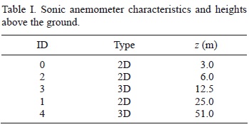 The meteorological mast is 51 m high, and is equipped with five ultrasonic anemometers: three of the 2D 4.382xx family, and two of the 3D 4.3830xx family (Adolf Thies GmbH and Co.). These instruments can report two or three wind velocity components and a meteorological variable usually known as sonic temperature, which is a good approximation to the virtual potential temperature (Kaimal and Gaynor, 1991) even under humid conditions near the sea level provided that only the fluctuations are involved in the calculations. The acquisition frequency for the sonic anemometers is 10 Hz, which allows for the analysis of several micrometeorological parameters such as turbulent intensity, kinematic heat and momentum turbulent transport, Monin-Obukhov length and friction velocity. However, most of the results in this report do not require high frequency measurements. The anemometers were located at 3, 6, 12.5, 25 and 51 m above the ground level, respectively, distributed as shown in Table I.