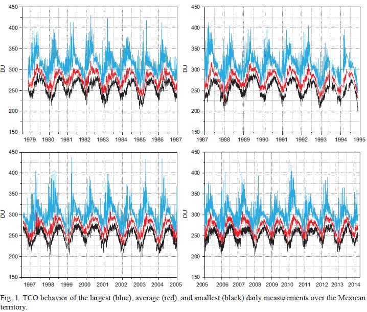 The calculation of the three types of daily TCO values (minimum, average and maximum) for Mexico was done by reading all ozone column values from TOMS and OMI daily files, covering longitudes between 84.5 and 114.5° W and latitudes between 14.5 and 29.5° N.